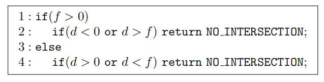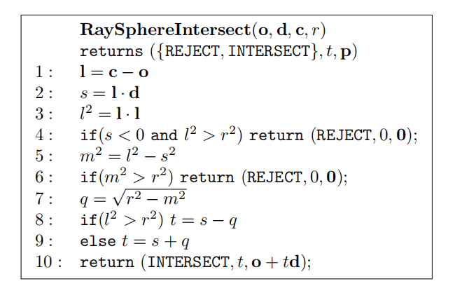 请注意,如果,那么射线就不会与球体相交,因此可以避免一些计算(例如:平方根和一些加法)。如果这个测试通过,那么可以计算两个解和。还需要进行一次额外的比较,来找到和中的最小正值。请参阅在线网站realtimerendering.com上的碰撞检测章节(第25章),来了解另一种数值更加稳定的求解方法[1446]。