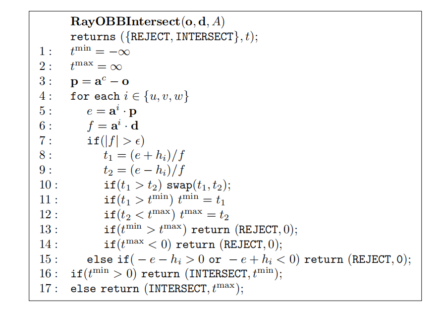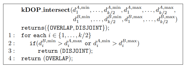 如果在任何时候都有(即空集),那么这两个BV不相交,终止测试;否则将会继续进行slab的重叠测试。当且仅当所有的,我们才认为两个BV重叠。根据分离轴测试(章节22.2),我们还需要对一组轴进行测试,这组轴与每个k-DOP和一条边的叉乘平行。然而,这些测试通常会被忽略,因为它们的开销要大于在性能上的回报。因此,如果下面的测试伪代码返回的是k-DOP相互重叠,那么它们实际上可能是不相交的。下面是k-DOP与k-DOP重叠测试的伪代码:
