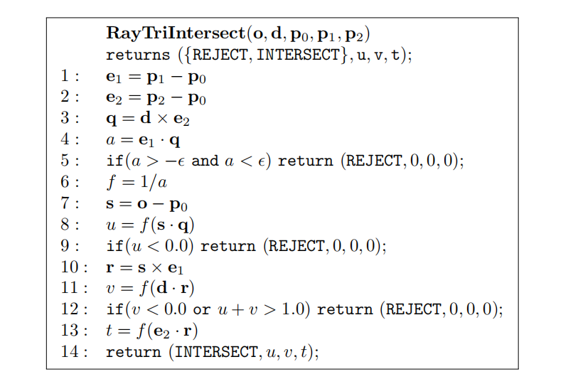 整个测试从6个行列式测试(两次三角形-平面测试)开始,其中前3个测试共用第一个参数,因此可以重用很多中间计算。原则上来说,行列式可以使用许多更小的子行列式来进行计算,当这些子行列式重复出现在行列式中时,计算结果可以进行共享。网上可以找到这个测试的相应代码[622],也可以对代码进行扩充,来计算实际的交点线段。