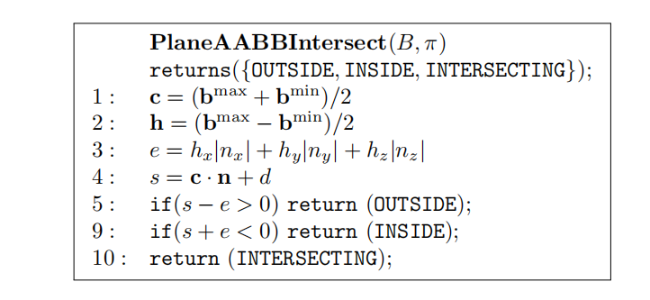 一旦我们找到了一个分离轴,那么算法就会终止并返回“没有重叠”。如果上述所有的测试都通过了,也就是说没有找到分离轴,那么说明这个三角形与box会发生重叠。
