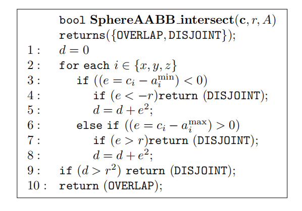 Larsson等人[982]提出了该算法的一些变体,包括一个速度更快的SSE向量化版本。他们的见解是在早期使用简单的拒绝测试,要么是逐轴进行、要么是在开始的时候全部进行。这个拒绝测试是:检查球心到box的距离是否大于半径。如果是的话,那么这个测试可以提前结束,因为此时球体不可能与box发生重叠。当二者重叠的概率较低时,这种早期拒绝方法的速度明显要更快。下面是他们测试的快速拒绝(quick rejections intertwined,QRI)版本。提前退出的测试出现在第4行和第7行,如果需要的话,可以将它们删除。
